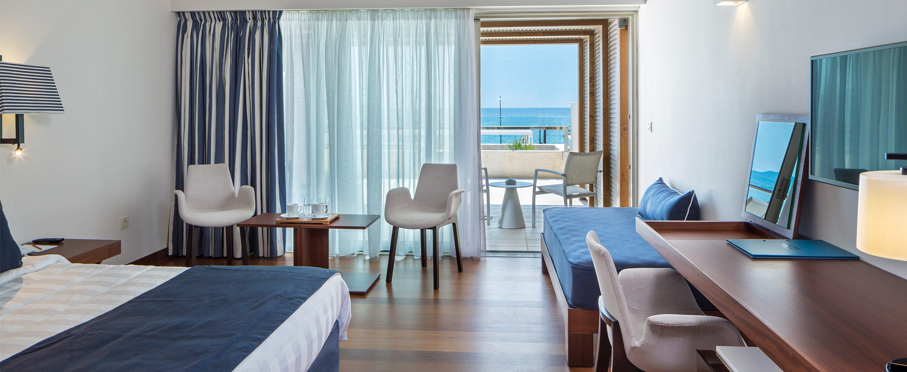 Πολυτελής διαμονή με άπλετη θέα στον Μεσσηνιακό Κόλπο! Οι επισκέπτες στα Superior Sea View δωμάτια του καταλύματος θα νιώσουν σα να βρίσκονται επάνω σε ένα υπερπολυτελές γιοτ, χάρη στο διακριτικό ντεκόρ και τον εσωτερικό σχεδιασμό με υλικά όπως το φίνο ξύλο και με το λευκό να κυριαρχεί. Αναπαυτικά έπιπλα, απαλά υφάσματα και άνετοι χώροι χαρακτηρίζουν αυτό τον τύπο δωματίων.